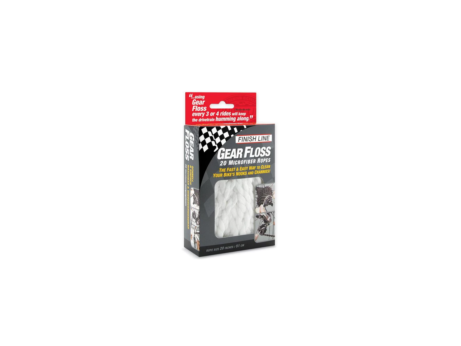 Detta Finish Line snöre används till besvärlig rengöring mellan tanhjulen på kassetten och vevpartiet. Detta paket från Finish Line innehåller 20 st snören, som funktionellt och snabbt kan rensa tandhjulen på kassetten.