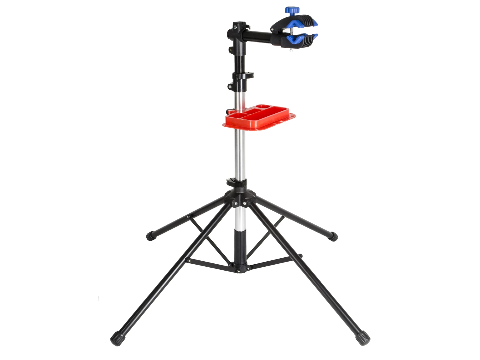 Mekställ med praktisk verktygslåda med magnet-funktion. Detta mekställ används när cykeln ska repareras, så du får den rätta höjden och arbetsställningen. Det kan fällas ihop så det tar minimalt med plats. Det krävs inga verktyg för att fälla ihop det och det kan göras snabbt. Klämman når över rör på 26-48 mm och kan vändas 360 grader. Spänningstrycket är fullt justerbart. Höjden på detta mekställ kan justeras från 114 till 180 cm.