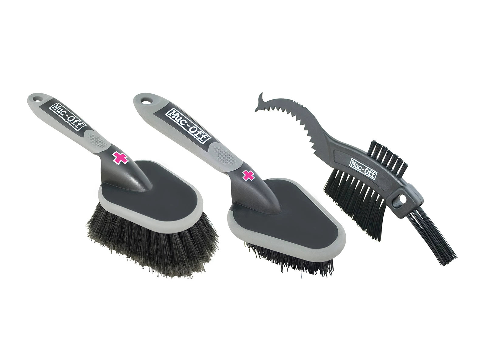 Du får ett borstkit med tre borstar, som har tre olika funktioner. Gemensamt för alla tre borstar är att de alla har ett bra gummigrepp, som gör att du får ett fast grepp även under våta förhållanden. I paketet får du Muc Off’s Claw Brush, som är utrustad med ett trebubbelt borsthuvud, som har hårda nylonhår samt en integrerad borste till att ta bort lera från skor. Du får även en Detailing Brush, som är perfekt till att ta bort smuts på tandhjul, nav och andra strama områden, som t.ex. upphängning eller gafflar. Den sista borsten i paketet är en Soft Washing Brush, som är designad till att rengöra ram och komponenter.
