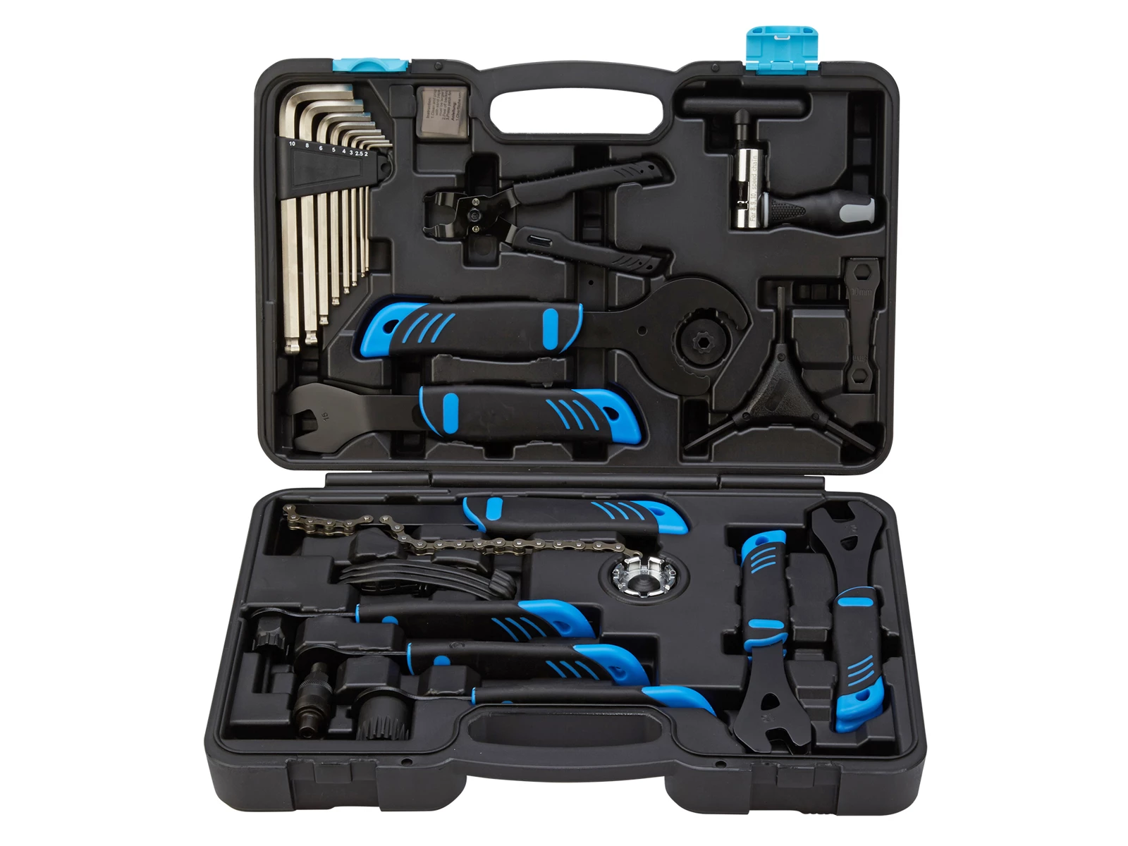 Med OnGear-verktygssatsen kan du själv hantera de flesta reparationer och underhåll på din cykel. Satsen innehåller 29 st. verktyg förpackat i en smart verktygslåda för hårdvara som gör det enkelt att ta ditt verktyg på språng. Alla verktyg är markerade med en fin blå färg som gör det enkelt att hitta dem om du skulle ha placerat något verktyg.