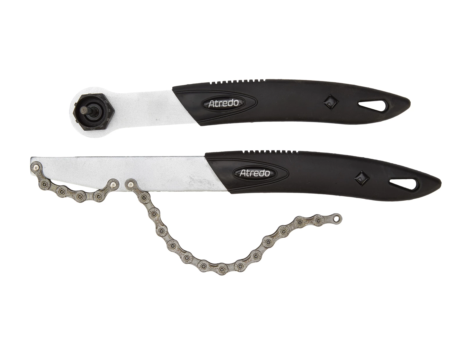 Denna frihjulshållare med kedja från Atredo underlättar arbetet med att ta isär en kassett. När du lossar låsringen på kassetten kan detta verktyg användas för att hålla kassetten på plats så att den inte springer runt när du vänder mot. Handtaget med räfflad gummibeläggning gör det lätt att hålla i verktyget medan du arbetar