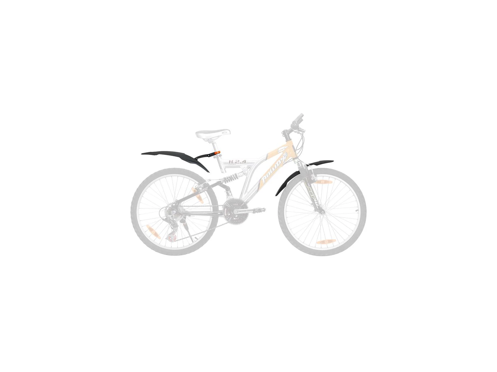 Framskärmen kan sitta på både fjädrande och styva framgafflar. Bakskärmen monteras på sadelpinnen.